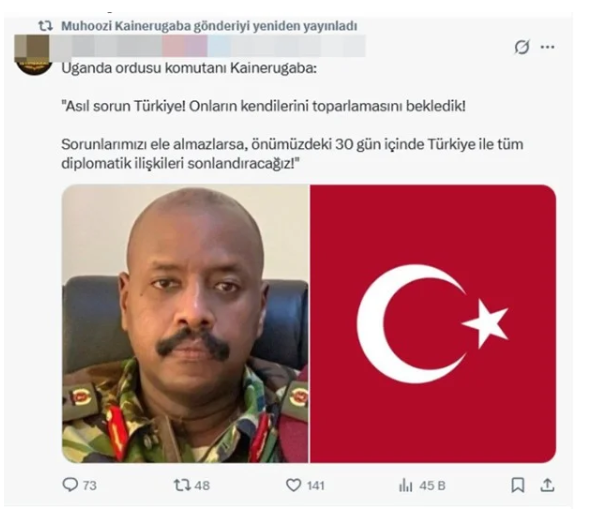 Öte yandan Kainerugaba, Türkiye ile ilişkilere dair de sert mesajlar verdi. Açıklamasında, yaşanan sorunların çözülmemesi halinde diplomatik ilişkilerin kesilebileceğini öne sürerek, bu konuda 30 günlük bir süre tanındığını iddia etti.